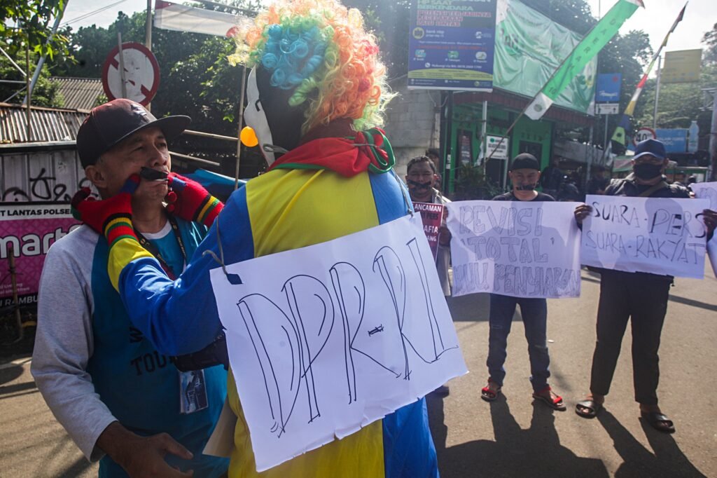 Selain itu, bentuk pesan penolakan terhadap RUU penyiaran dan kritisi terhadap DPR RI tersebut juga ditunjukkan lewat aksi teatrikal seorang badut yang berperan sebagai anggota DPR saat merampas kamera wartawan yang sedang melakukan tugas peliputan. Cekcok dan keributan pun terjadi antara wartawan dan ‘badut DPR’ tersebut. Mulut wartawan lantas dibungkam oleh si ‘DPR’.